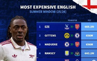 英夏球員轉(zhuǎn)會費(fèi)榜:埃澤高居榜首,吉滕斯、馬杜埃凱次之。